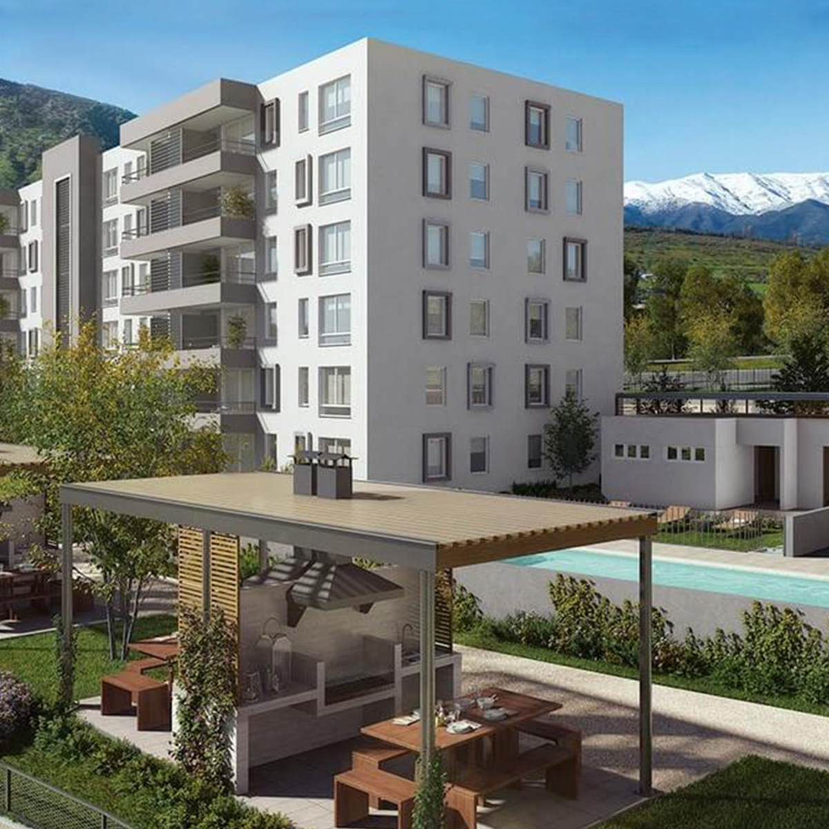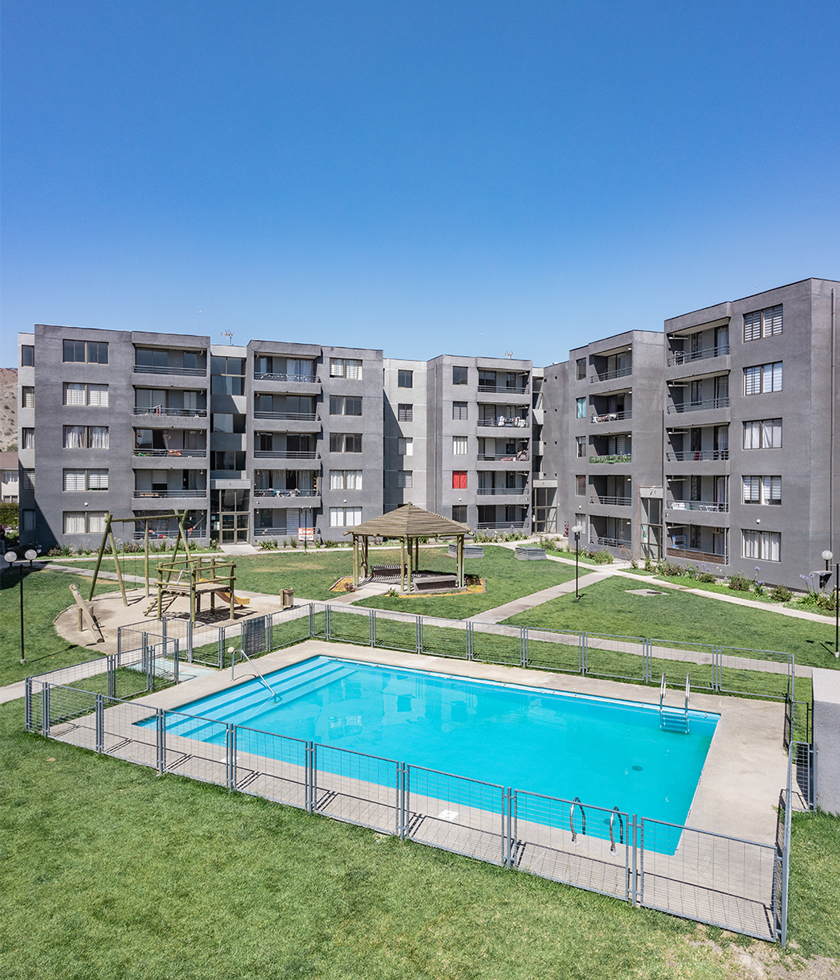 Jardines Lo Campino es un tranquilo condominio con accesos controlados, conformado por 6 edificios de 5 pisos cada uno y cómodos departamentos de 3 dormitorios, pensados especialmente para la vida en familia.